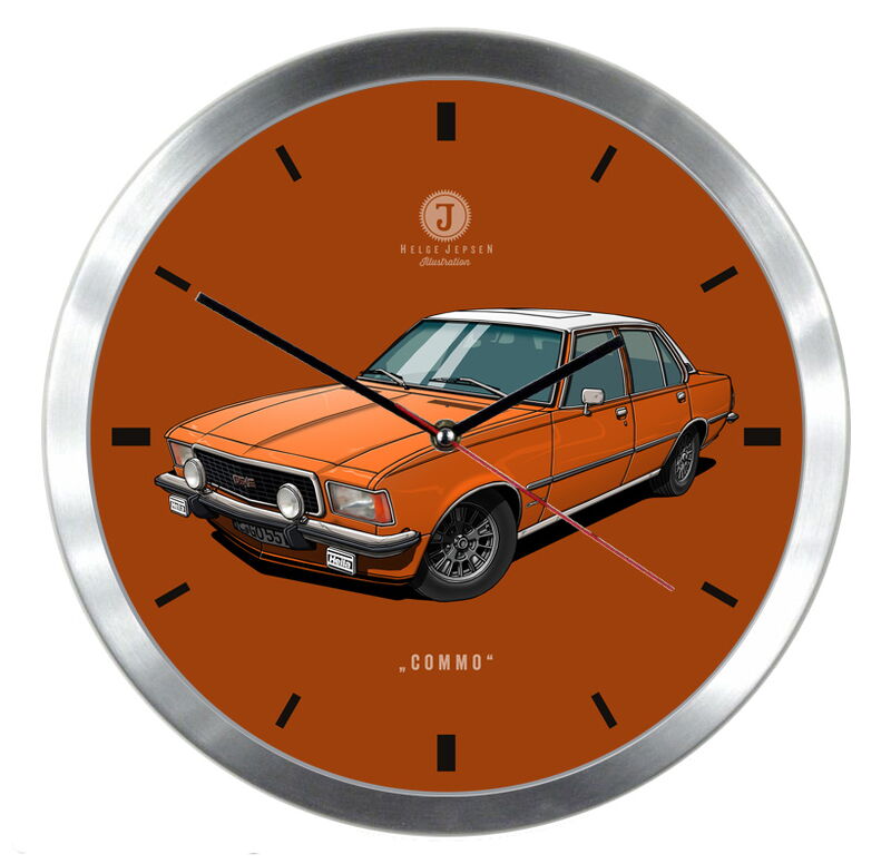 O2 Helge Jepsen Wanduhr mit Illustration eines Opel Commodore orange