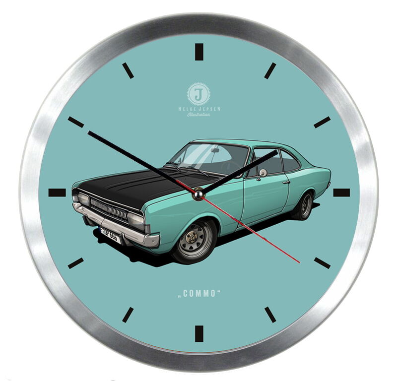 O3 Helge Jepsen Wanduhr mit Illustration eines Opel Commodore blau
